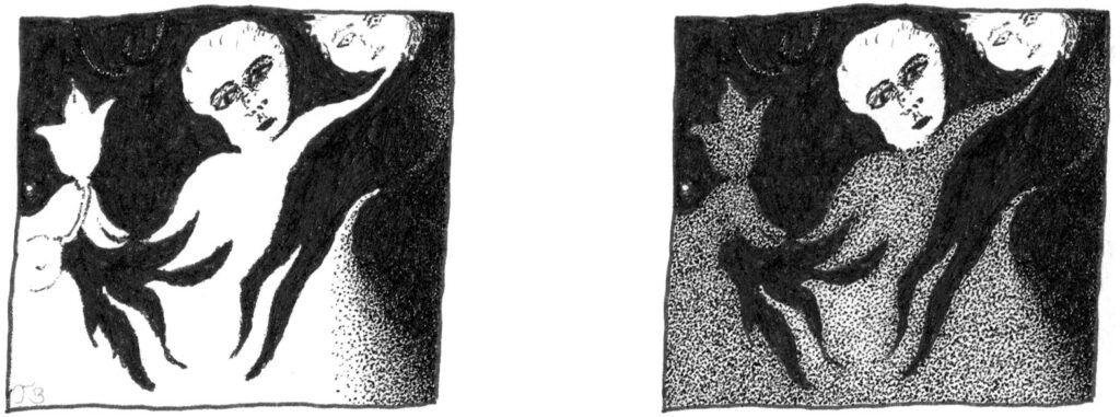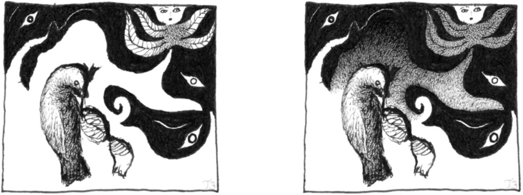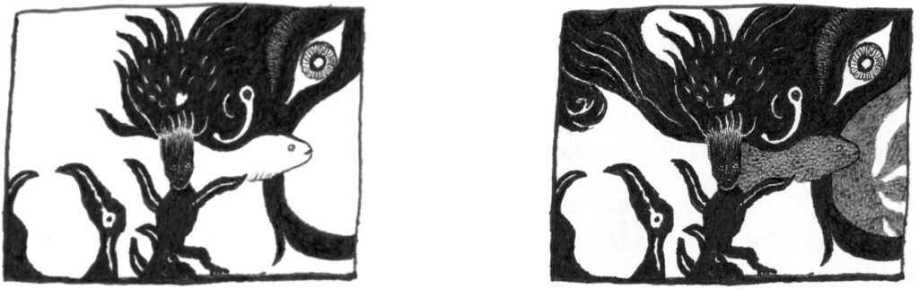 Ibland tycker jag en pennteckning har något som den är, men har samtidigt lust att jobba vidare. Då brukar jag skanna den innan jag fortsätter.